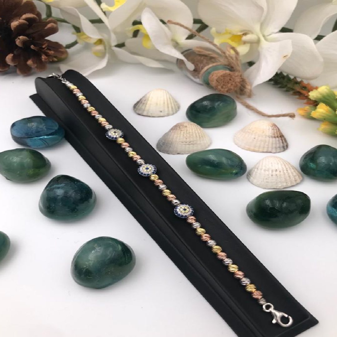 Gümüş Üzeri Altın Kaplama Dorika Tek Sıra Toplu Nazar Boncuklu Günlük Spor Bileklik