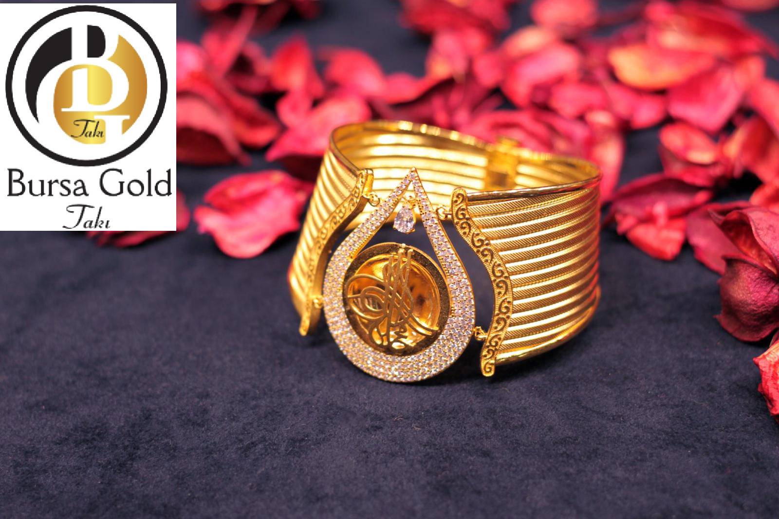 24 Ayar Has Altın Kaplama Zirkon Taşlı Osmanlı Tuğralı Damla Model Trabzon Hasır Kelepçe