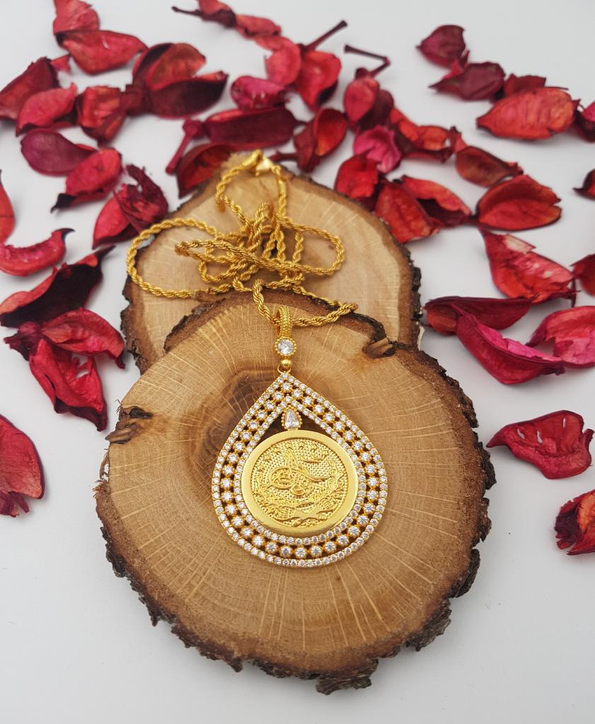 24 Ayar Has Altın Kaplama Osmanlı Tuğralı Zirkon Taşlı Halat Zincirli Kolye