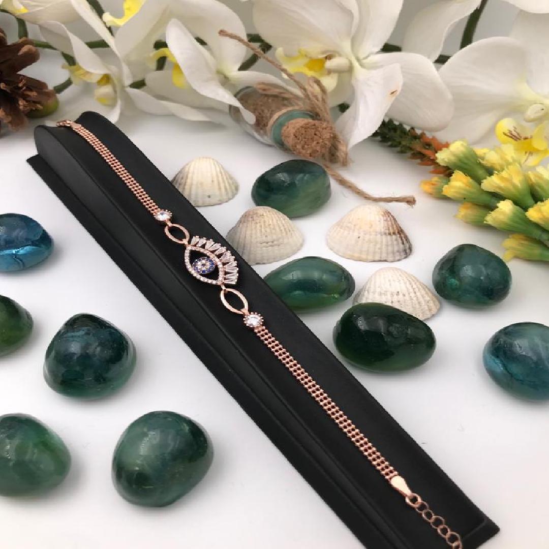 Gümüş Üzeri Rose Altın Kaplama Taşlı Nazar Boncuklu Günlük Spor Bileklik
