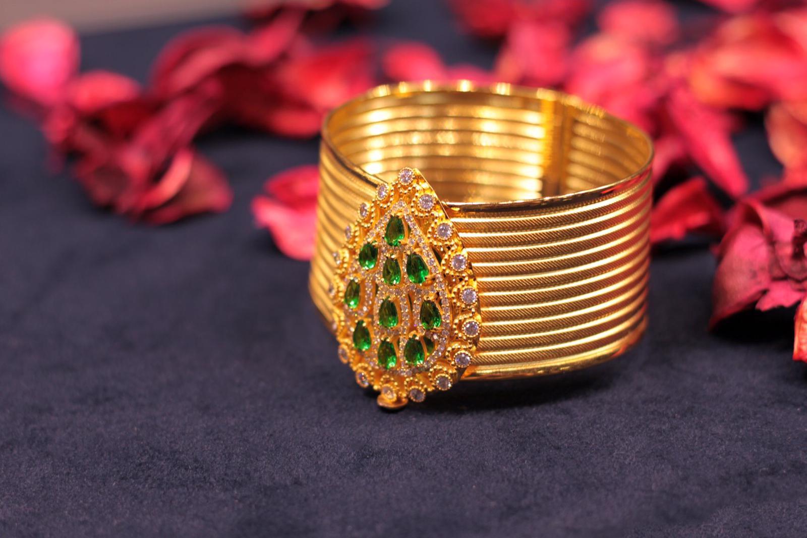 24 Ayar Has Altın Kaplama Yeşil Yakut Taşlı Damla Model Trabzon Hasır Kelepçe